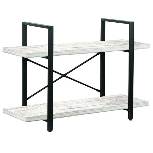 The Dakota™ designer bookshelf features a modern designed clean metal framework which creates an industrial inspired display great for any decor. The solid build/open design with sturdy metal bar construction provides strength and an open framework for easy decorating access. Compact sizing and the airy spacing between shelves offers maximum display capacity in a small footprint. X-support back bars criss cross to add stability and a design element to the unit. This bookshelf comes complete with two barnwood colored shelves.
