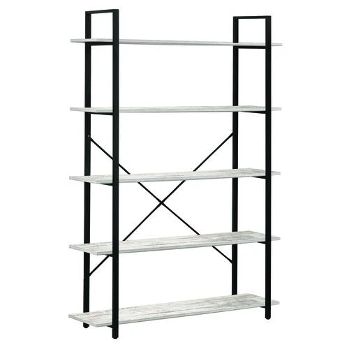 The Dakota™ designer bookshelf features a modern designed clean metal framework which creates an industrial inspired display great for any decor. The solid build/open design with sturdy metal bar construction provides strength and an open framework for easy decorating access. Compact sizing and the airy spacing between shelves offers maximum display capacity in a small footprint. X-support back bars criss cross to add stability and a design element to the unit. This bookshelf comes complete with five barnwood colored shelves.