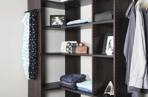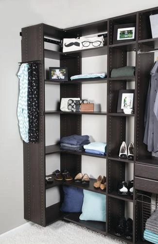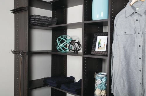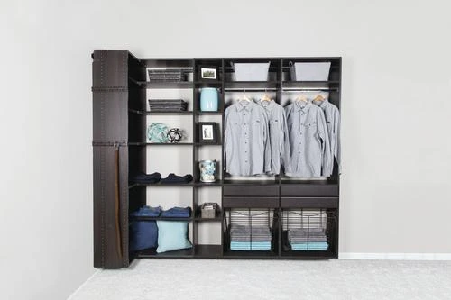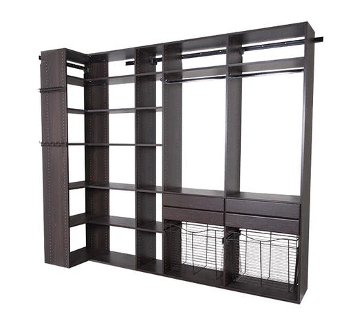 - Easy assembly with universal uprights, cam locking shelves, corner brackets and adjustable hang brackets