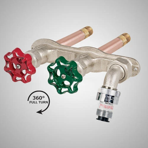Heavy duty close coupled hot and cold anti-siphon hydrant with backflow preventer is plated in satin nickel with an adjustable spigot which allows it to be installed horizontally or vertically. USA