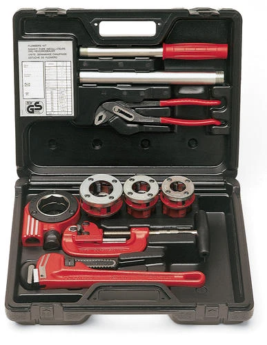 This threading kit Includes: a SUPER CUT ratchet threader 1-1/4″, die heads 1/2″, 3/4″, 1″, 1-1/4″ steel pipe cutter, 10″ pliers, 14″ HD wrench, teflon line and case.
